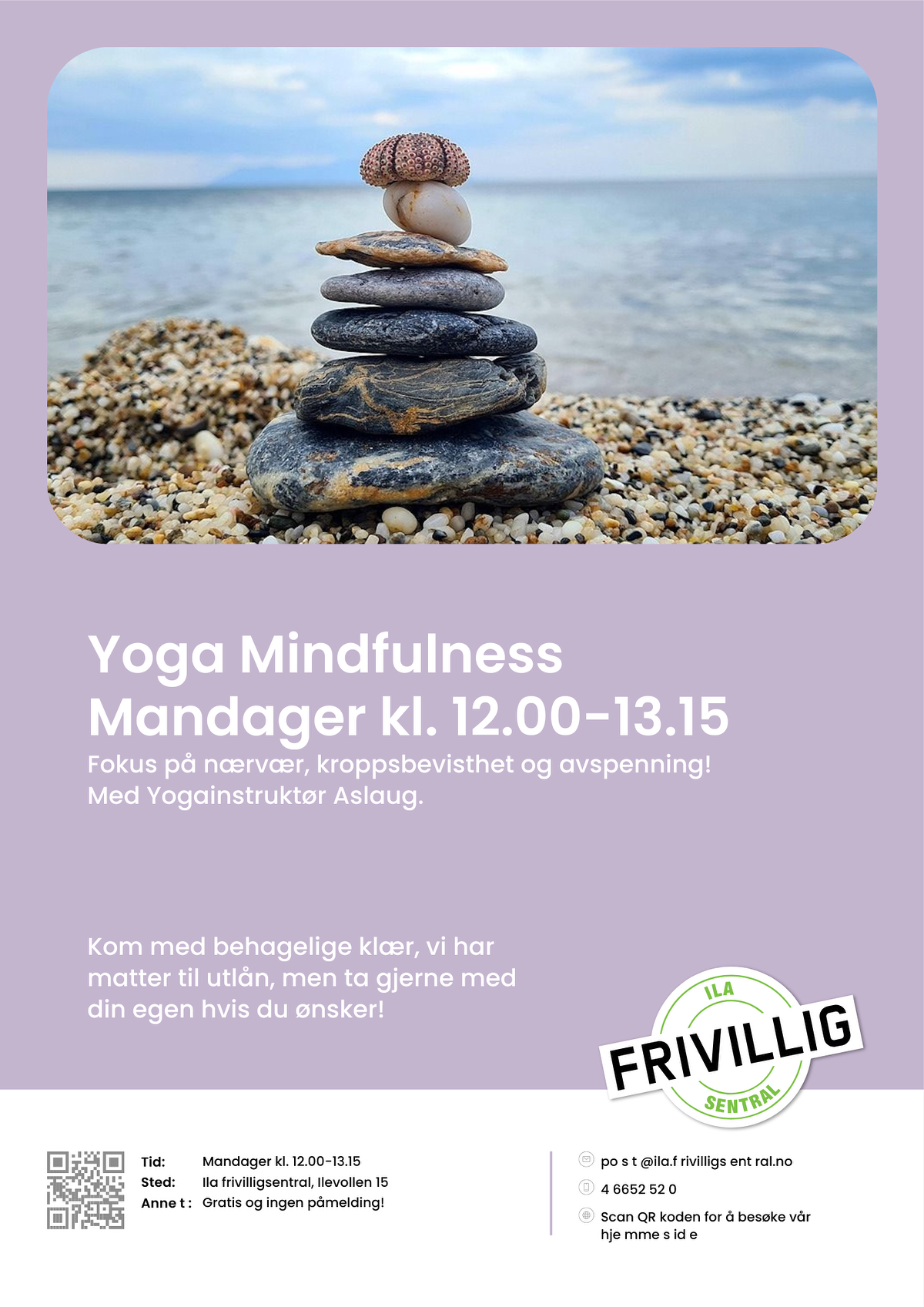 Fokus på nærvær, kroppsbevisthet og avspenning! Kom med behagelige klær, vi har matter til utlån, men ta gjerne med din egen hvis du ønsker! Gratis, Drop-in og ingen påmelding!