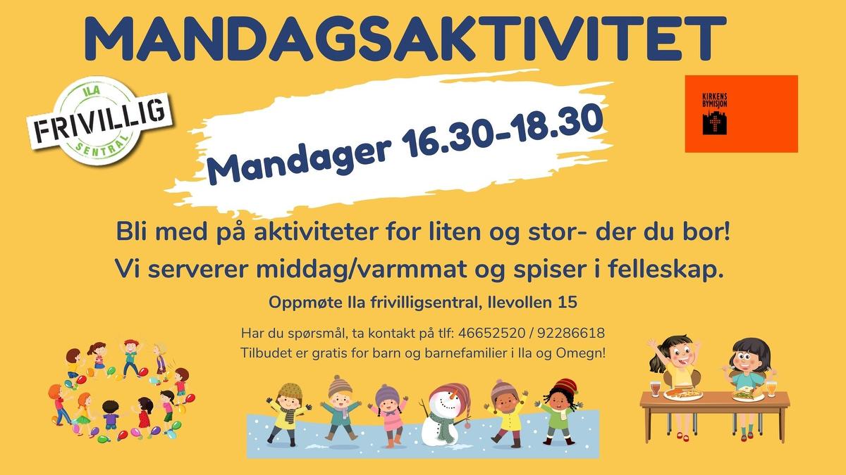 Ila frivilligsentral arrangerer «Mandagsaktivitet». Arrangementet er for barnefamilier i Ila og Omegn hver mandag kl 16.30-18.30. Du trenger ikke å være medlem og det er helt gratis å bli med! Her får barna prøve ulike aktiviteter og lek mens frivillige lager middag/varmmat som spises i fellesskap. Oppmøte på Ila frivilligsentral. Ingen påmelding. Ved spørsmål ta kontakt på tlf. 46652520/92286618