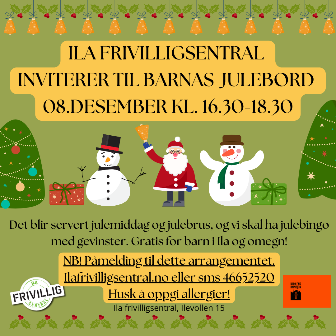 Ila frivilligsentral ønsker velkommen til julebord for barn og unge. Det blir servert julemiddag og julebrus, og vi skal ha julebingo med gevinster. Arrangementet er fra kl. 16.30-18.30 og er gratis! Frist for påmelding er 01.12.