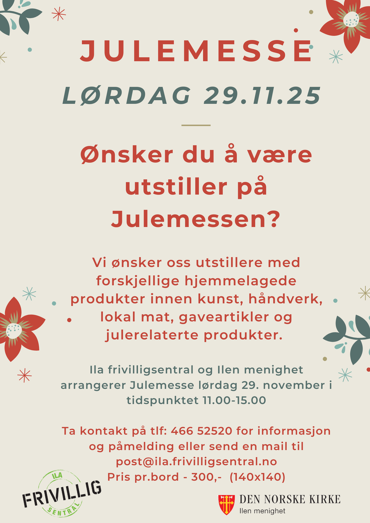 Vi ønsker oss utstillere med forskjellige hjemmelagede produkter innen kunst, håndverk, lokal mat, gaveartikler og julerelaterte produkter. Ila frivilligsentral og Ilen menighet arrangerer Julemesse lørdag 29. november i tidspunktet 11.00-15.00 Ta kontakt på tlf: 466 52520 for informasjon og påmelding eller send en mail til post@ila.frivilligsentral.no Pris pr.bord - 250,- (140x140)
