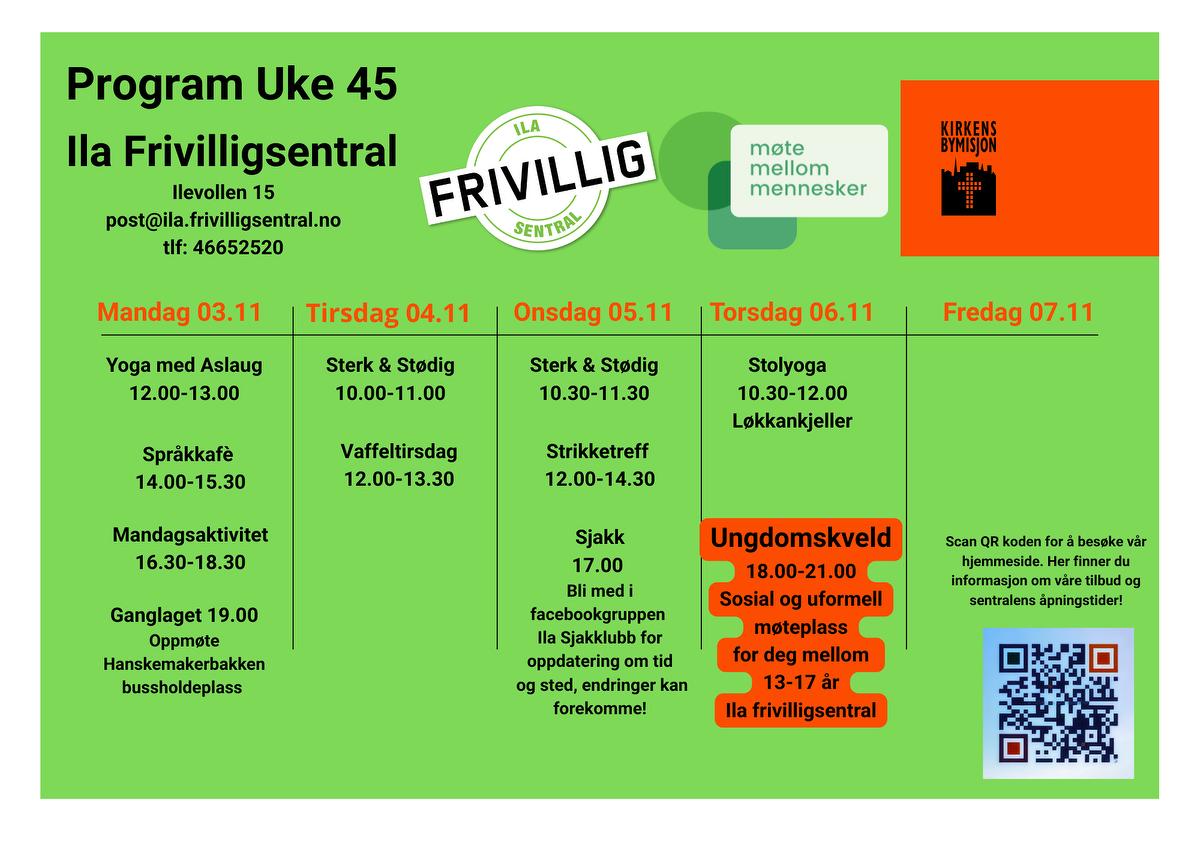Hva skjer hos Ila frivilligsentral uke 44 Her finner du oversikt over ukens aktiviteter!